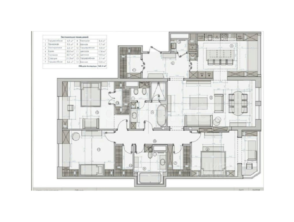 Планировка: прихожая, кухня, гостиная-столовая, спальня, 2 детские комнаты, 2 с/у, 3 гардеробные. Потолки 3м.